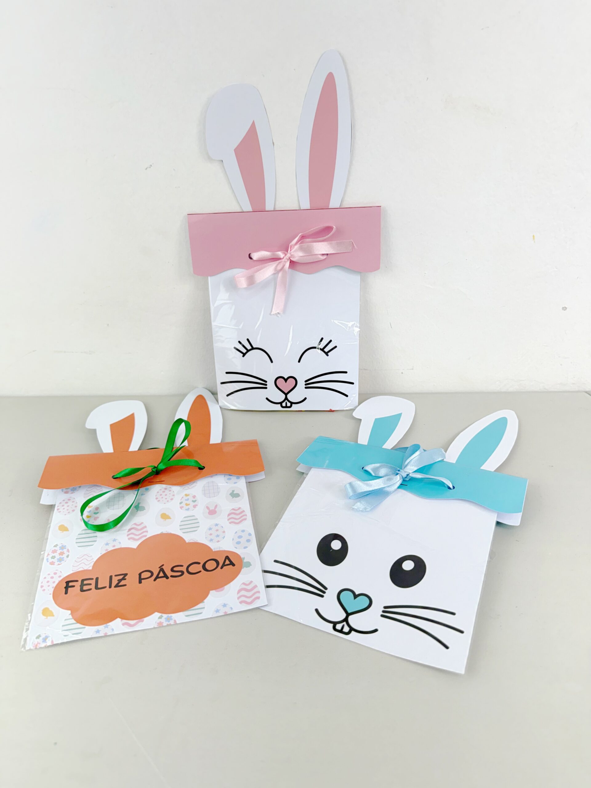 Esse kit vem com três modelos de sacolinhas de Páscoa nas cores azul, rosa e laranja.